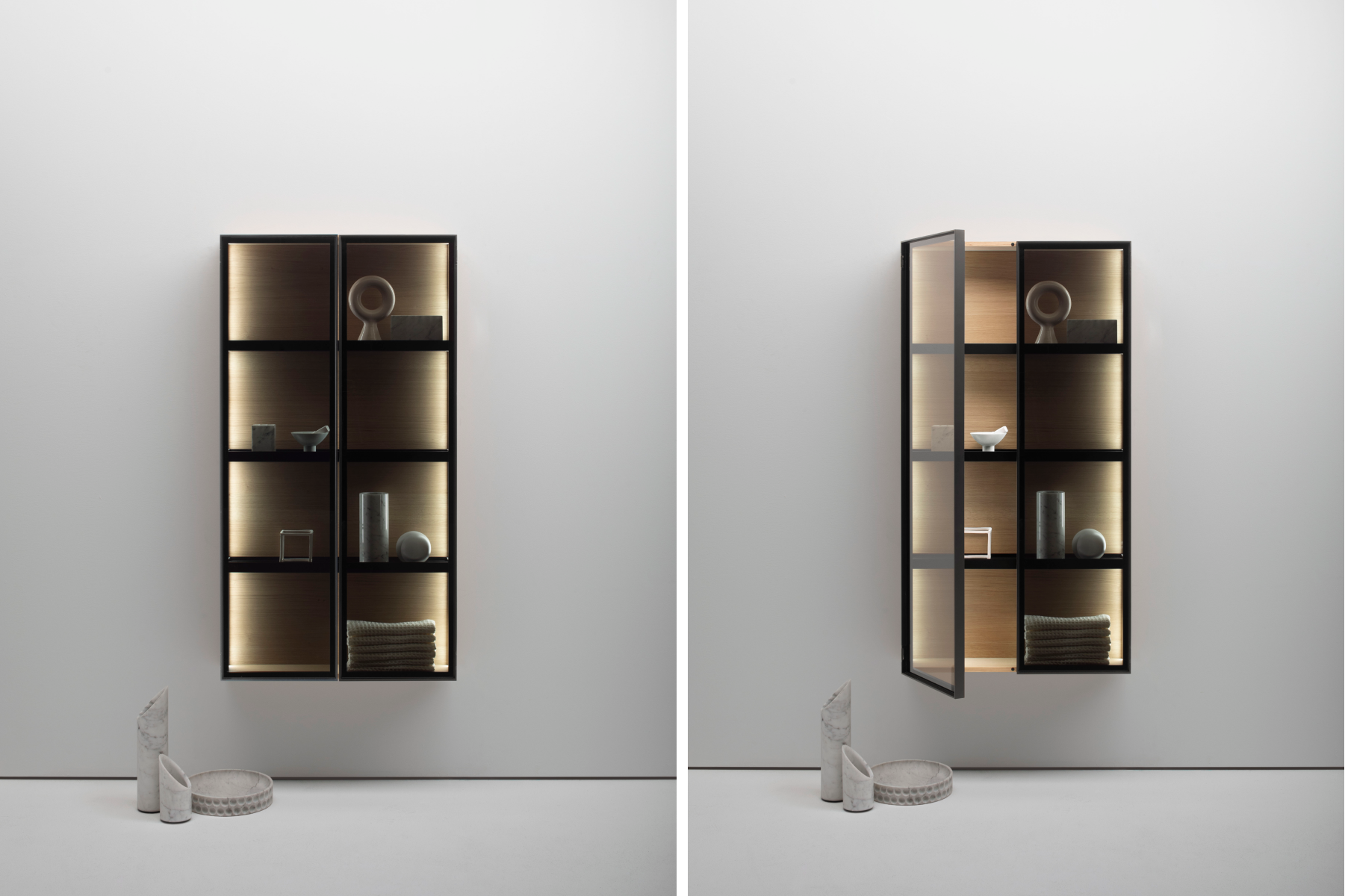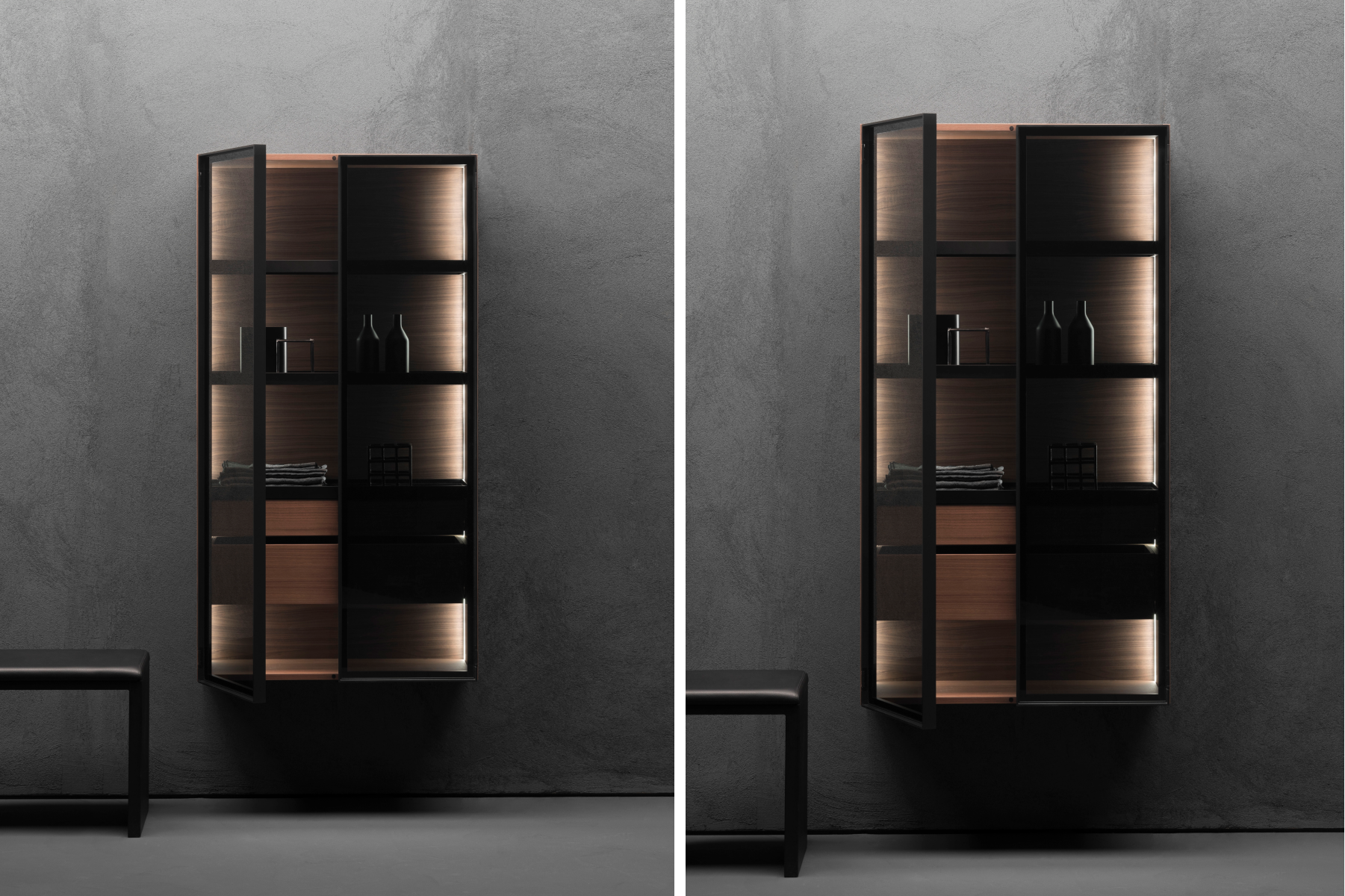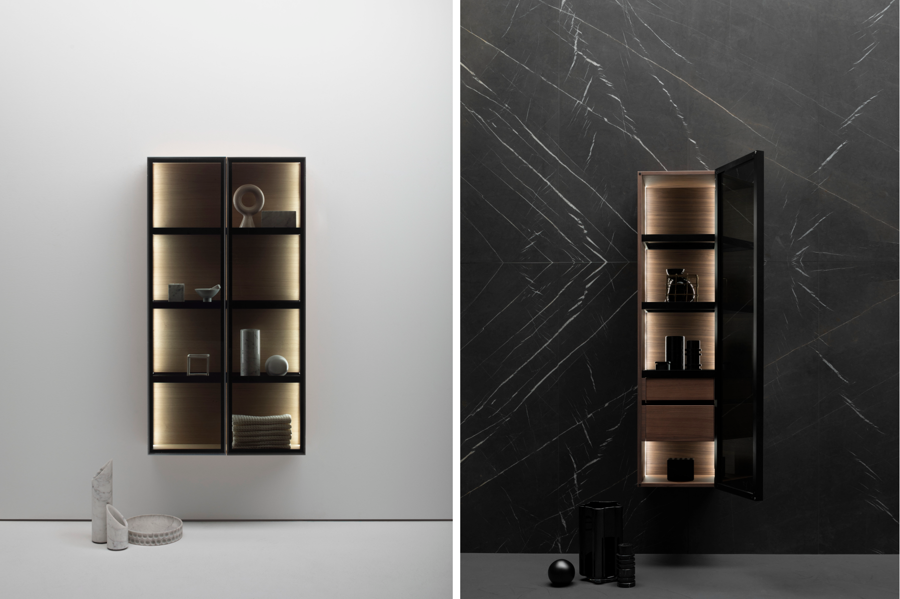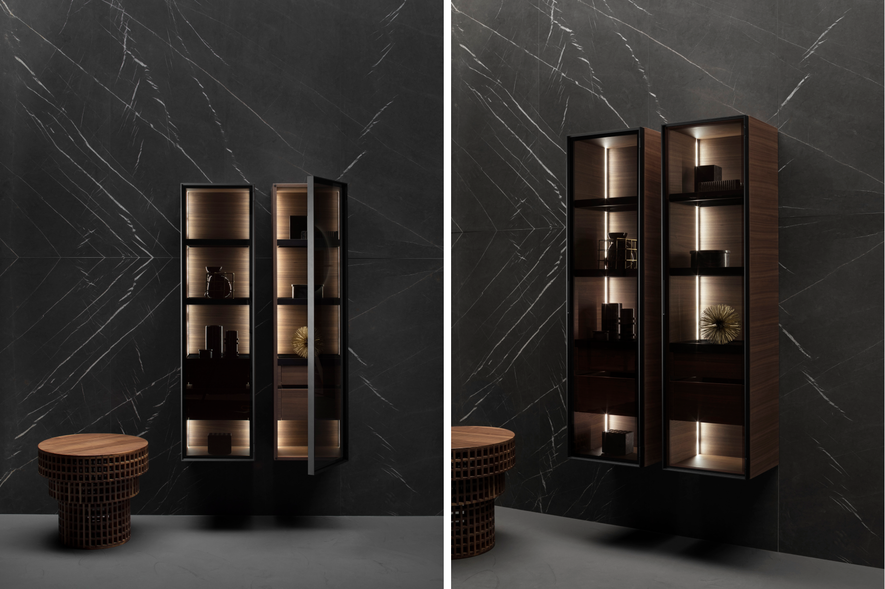 La collezione si concretizza come un sistema configurabile in diverse composizioni e dimensioni. Disponibile in due differenti profondità, 20 e 35 cm, viene completato da molteplici optional e accessori di pregio come l’illuminazione interna led, utile anche come luce di cortesia, e gli accessori dei cassetti.