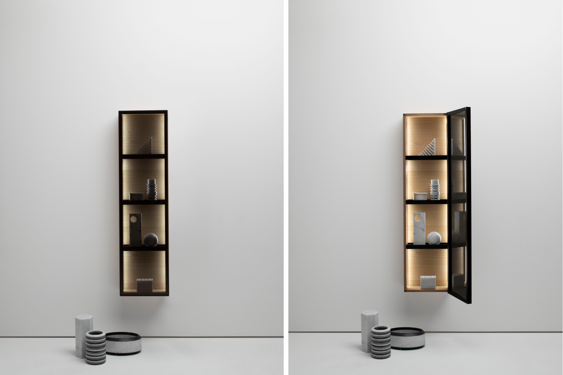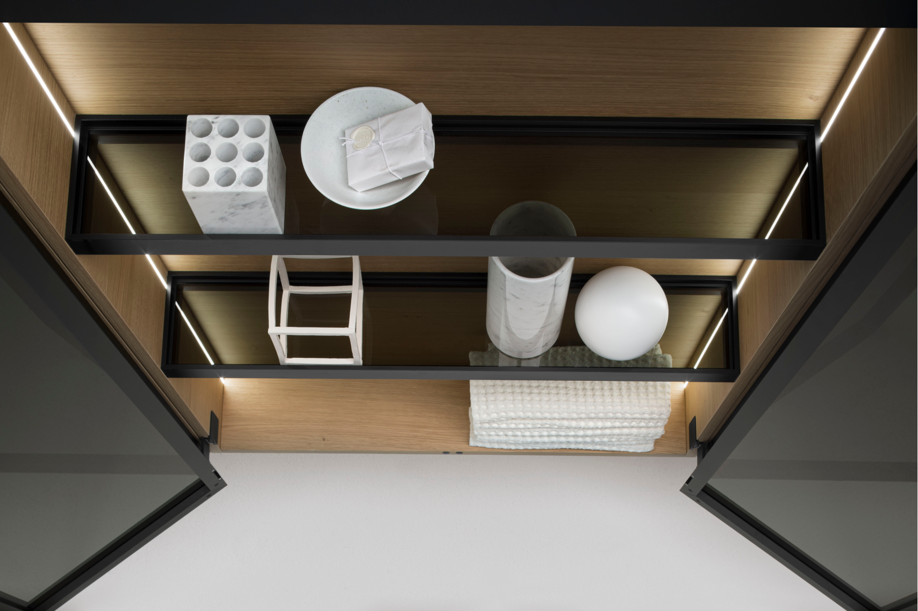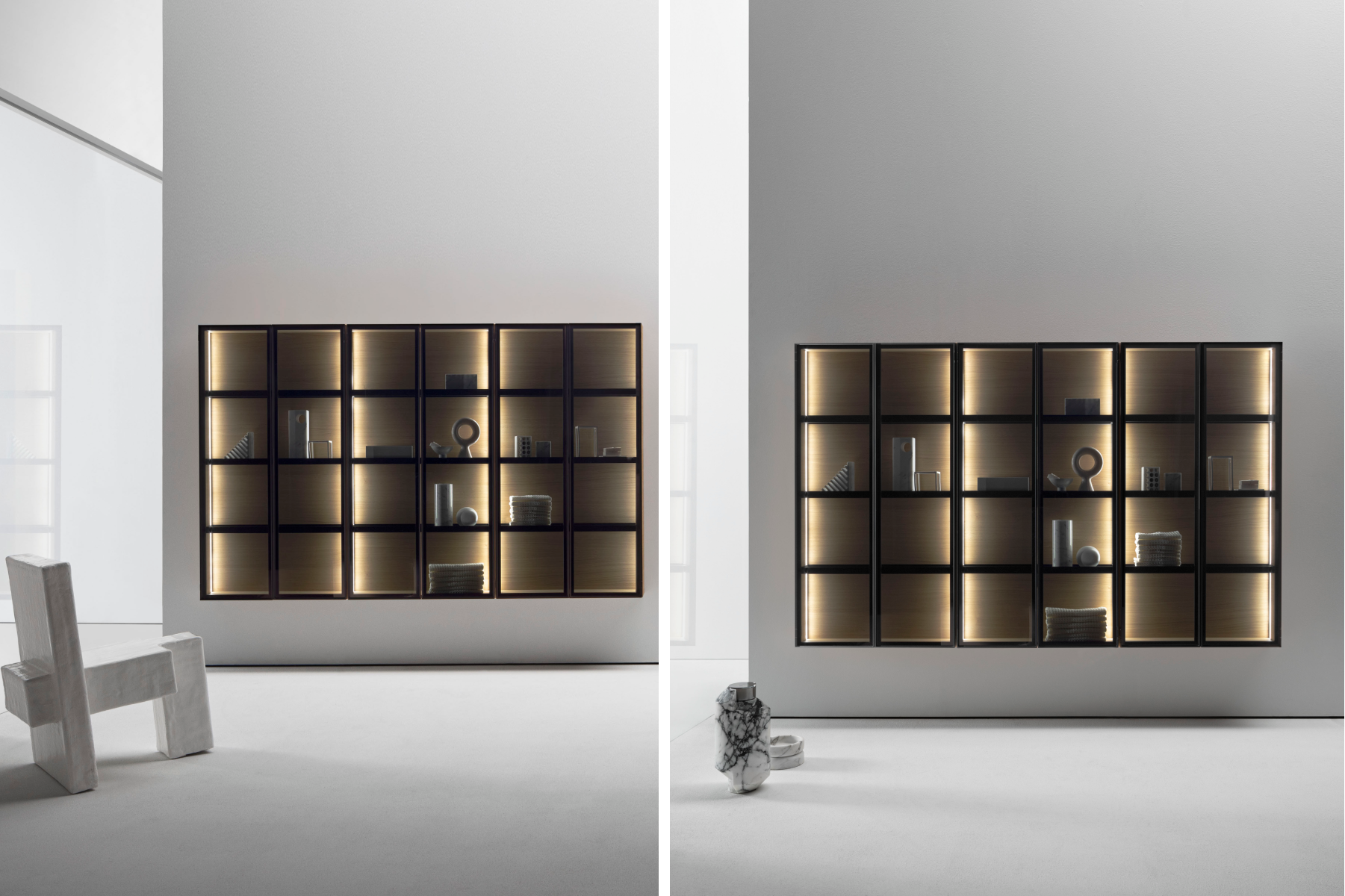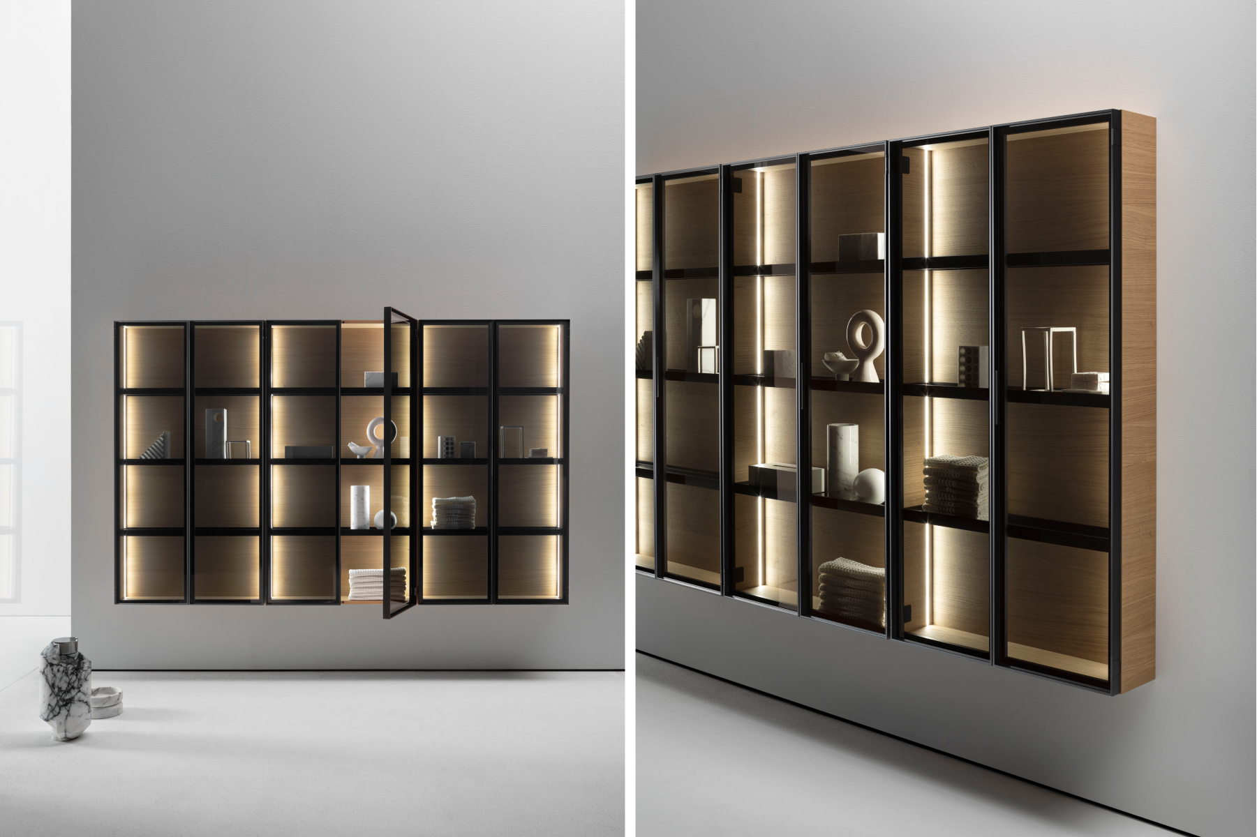 La collezione si concretizza come un sistema configurabile in diverse composizioni e dimensioni. Disponibile in due differenti profondità, 20 e 35 cm, viene completato da molteplici optional e accessori di pregio come l’illuminazione interna led, utile anche come luce di cortesia, e gli accessori dei cassetti.