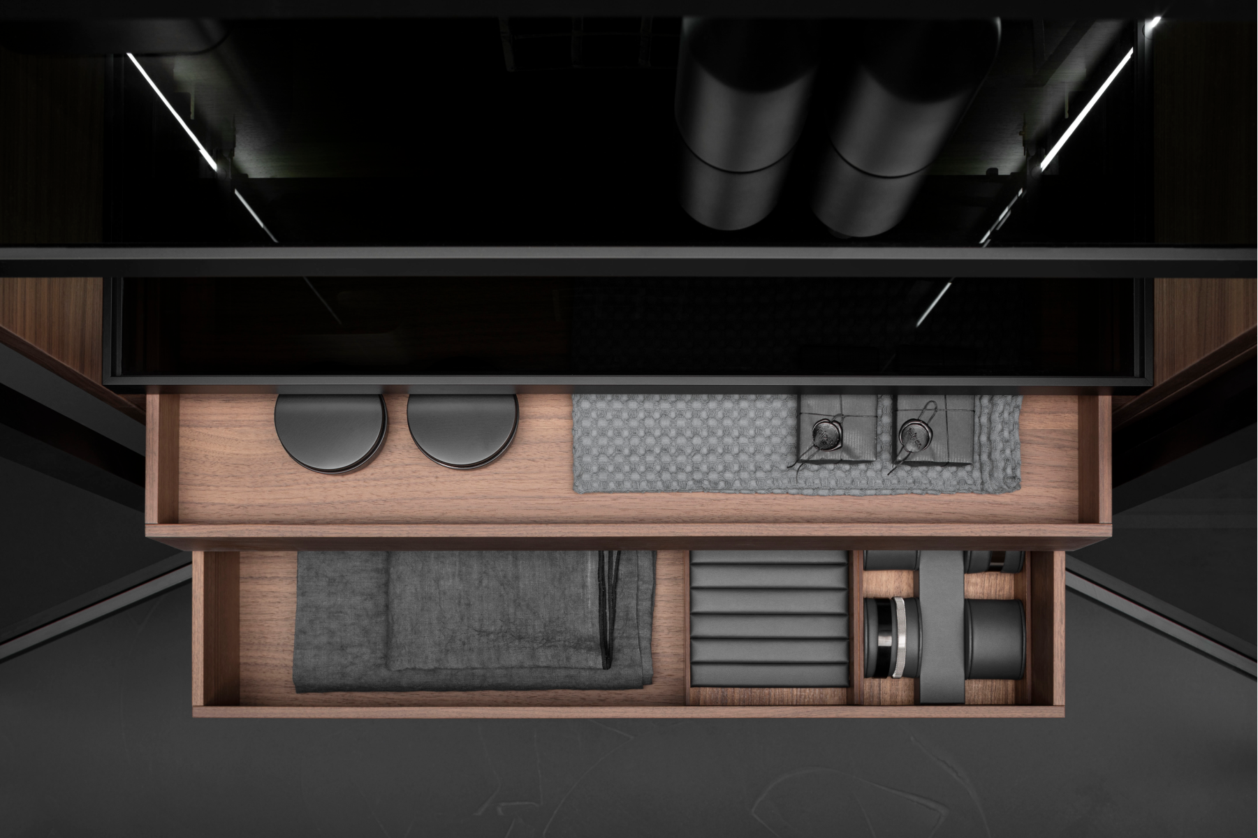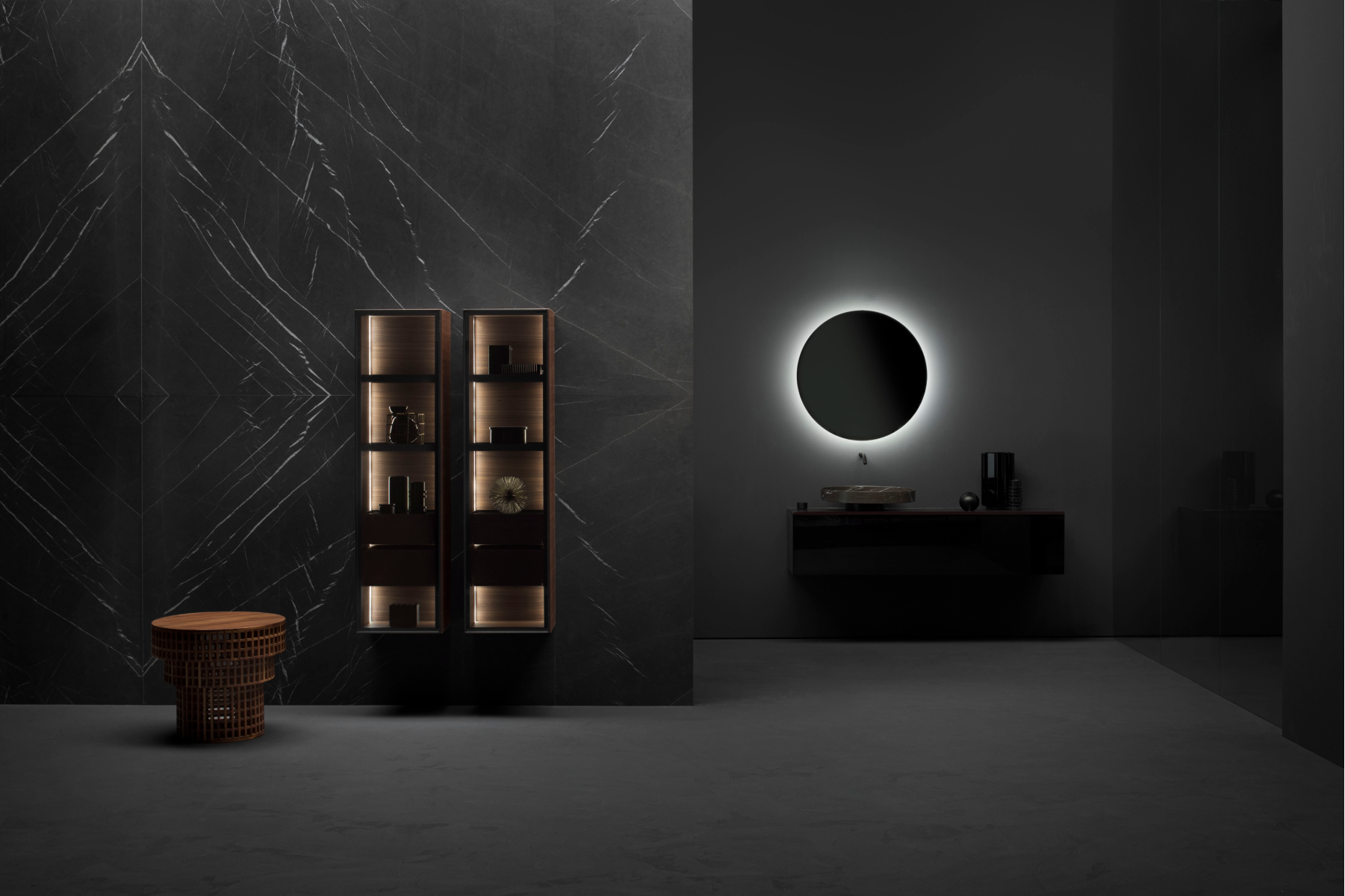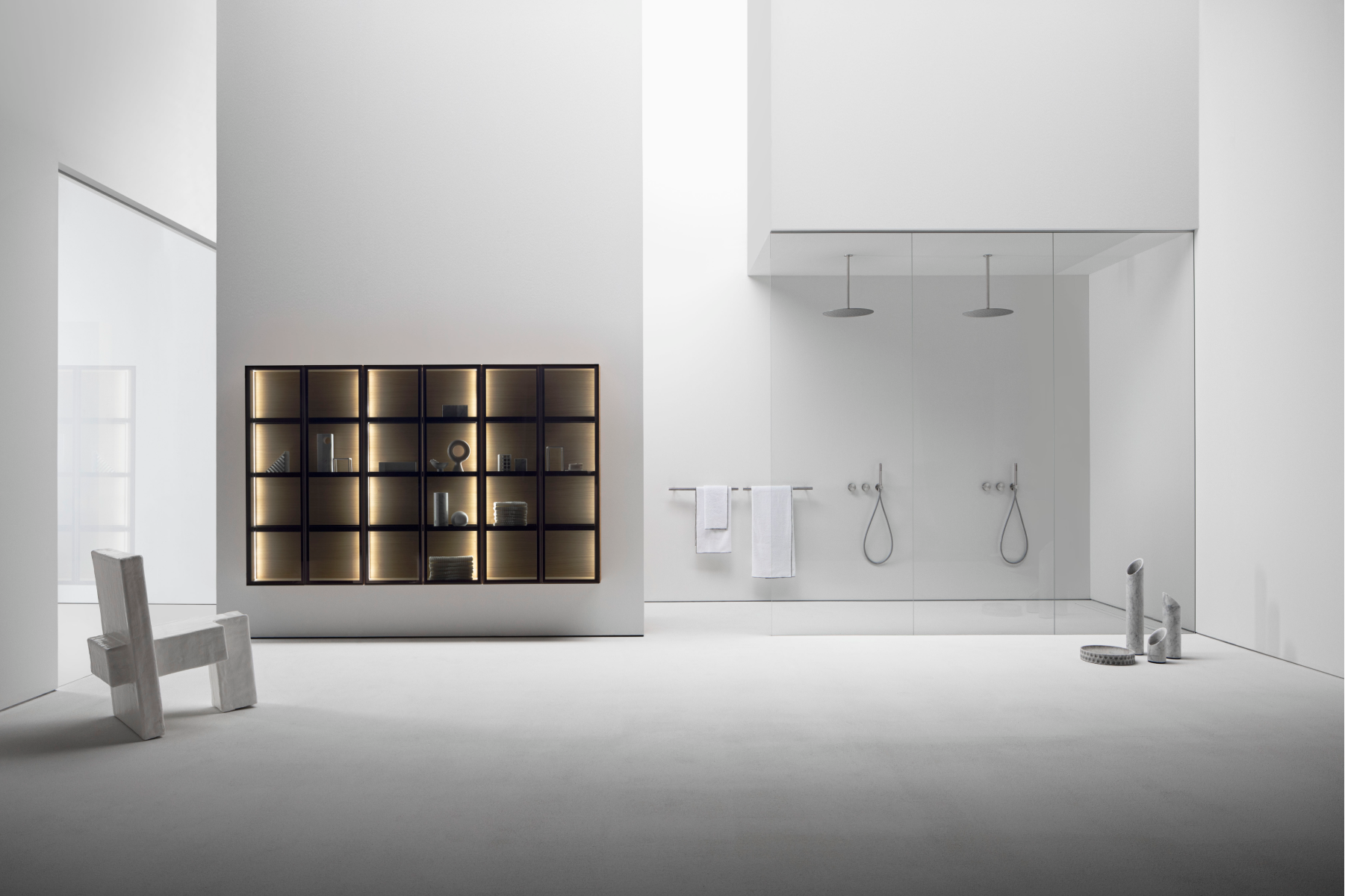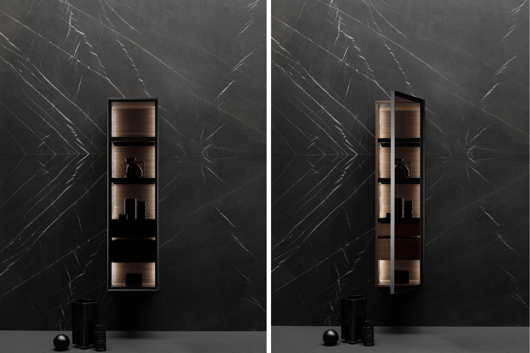 La collezione si concretizza come un sistema configurabile in diverse composizioni e dimensioni. Disponibile in due differenti profondità, 20 e 35 cm, viene completato da molteplici optional e accessori di pregio come l’illuminazione interna led, utile anche come luce di cortesia, e gli accessori dei cassetti.