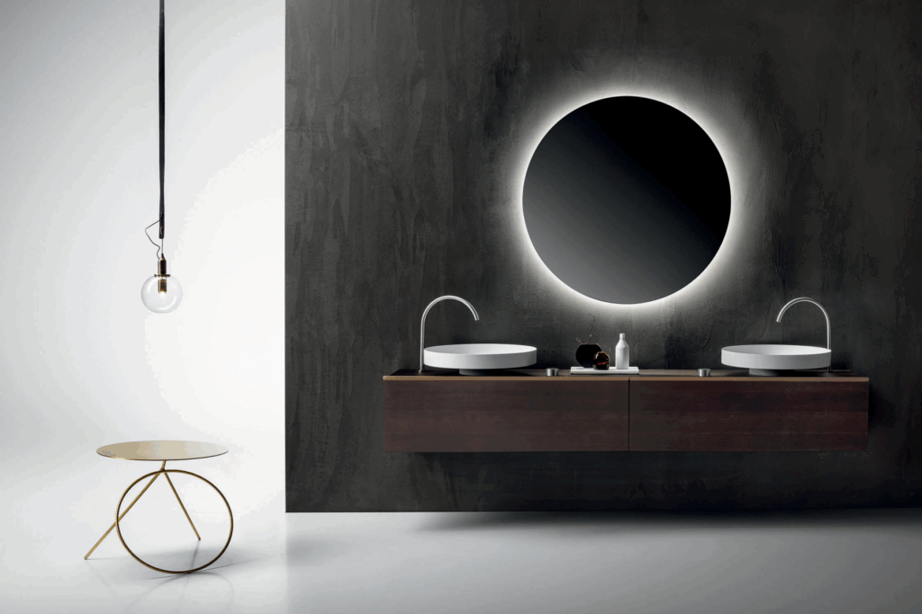La collezione è caratterizzata dall’iconico lavabo tondo da appoggio e dalla maniglia passante in acciaio che definisce gli elementi strutturali a 45 gradi.