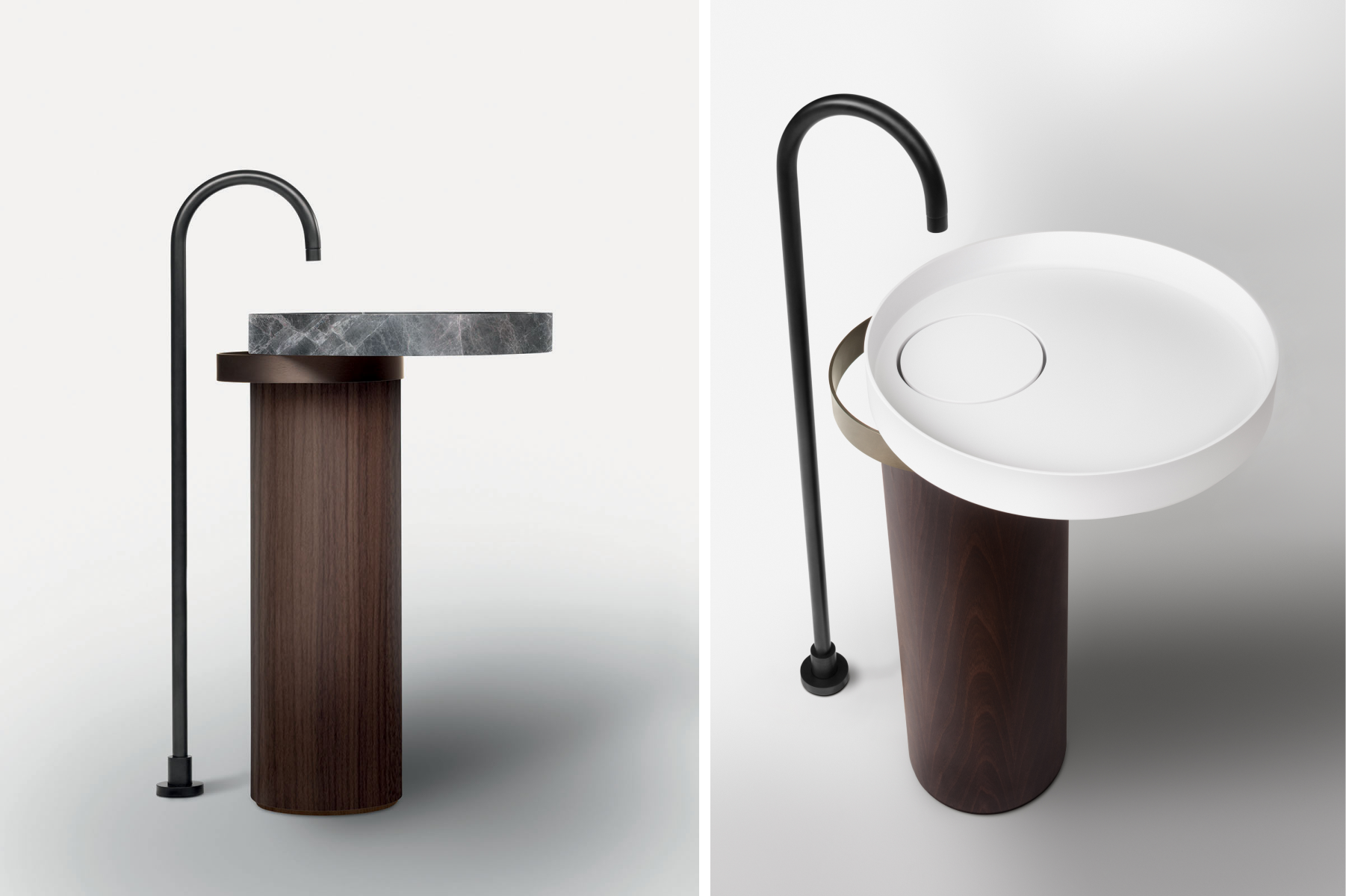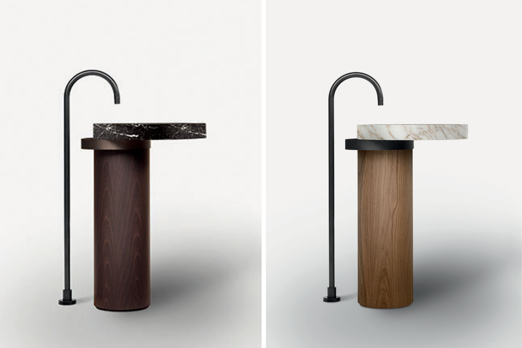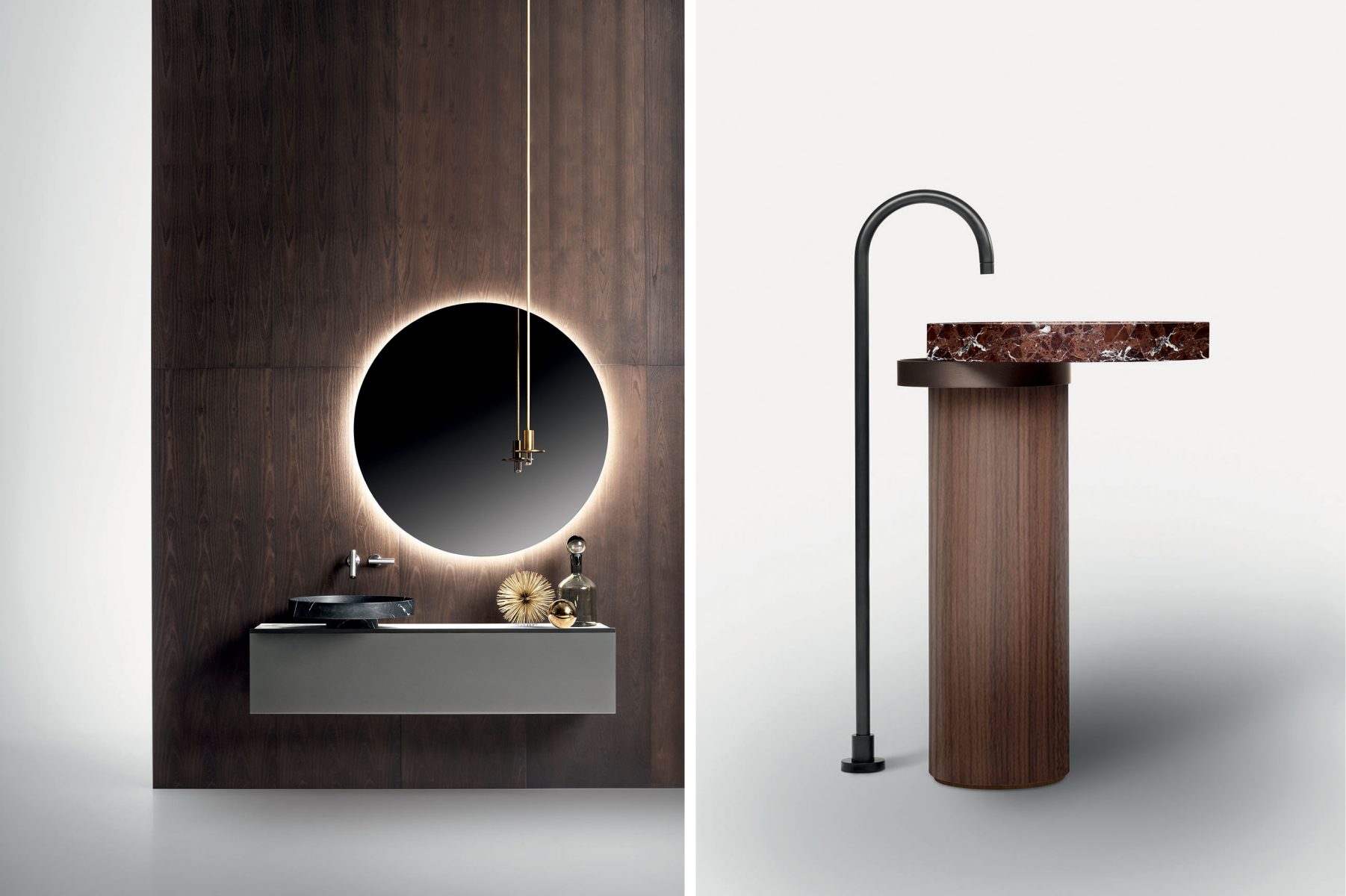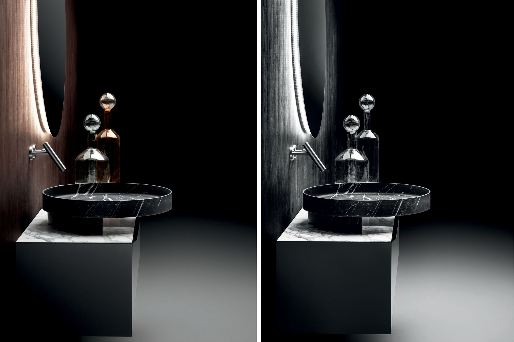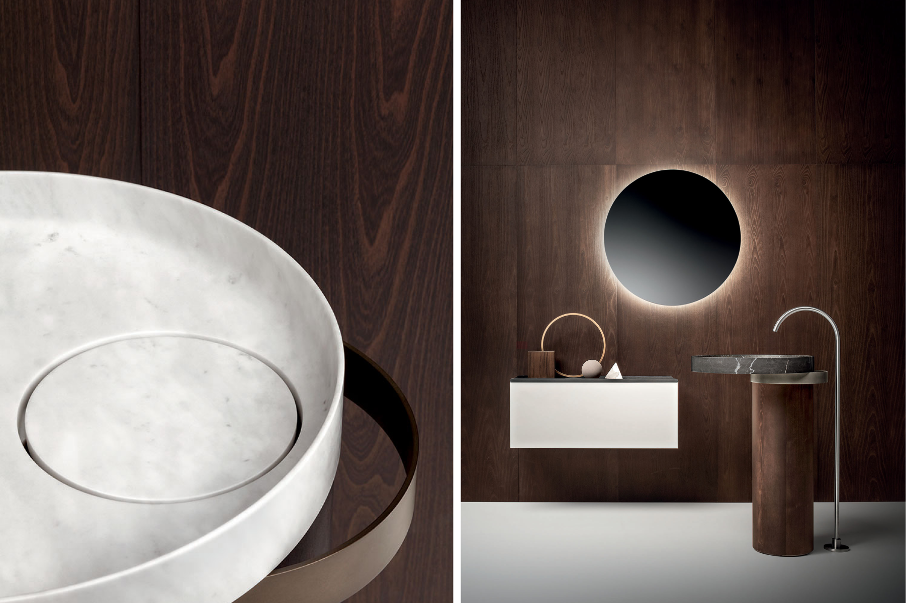 La progettazione razionale del designer, fatta di forme geometriche essenziali, incontra i materiali più preziosi e una cura produttiva sartoriale, dando vita a prodotti scultorei, dal forte carattere. La collezione include mobili porta lavabo, mobili contenitori, lavabi da appoggio e freestanding, realizzati giocando con diverse matericità.
