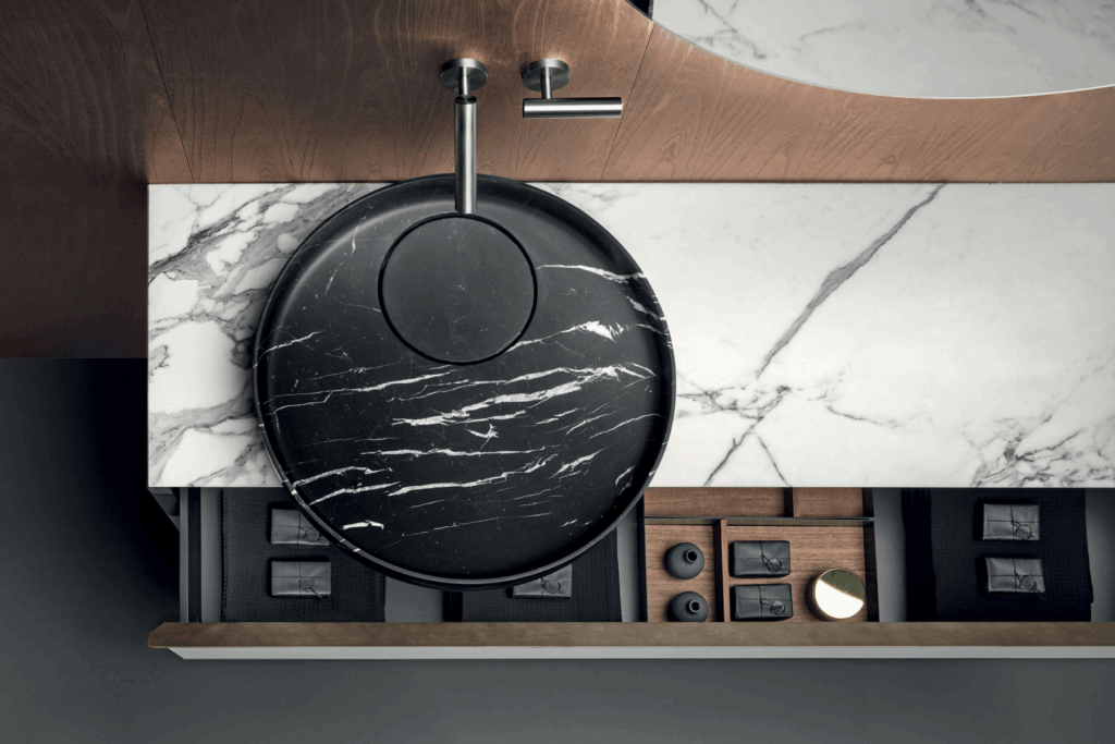 Il lavabo può essere realizzato nei nuovi marmi a catalogo, ricavati dal pieno con bordi ultrasottili di 8mm di spessore, e in Cristalplant Bio Active nei colori della nuova palette cromatica.