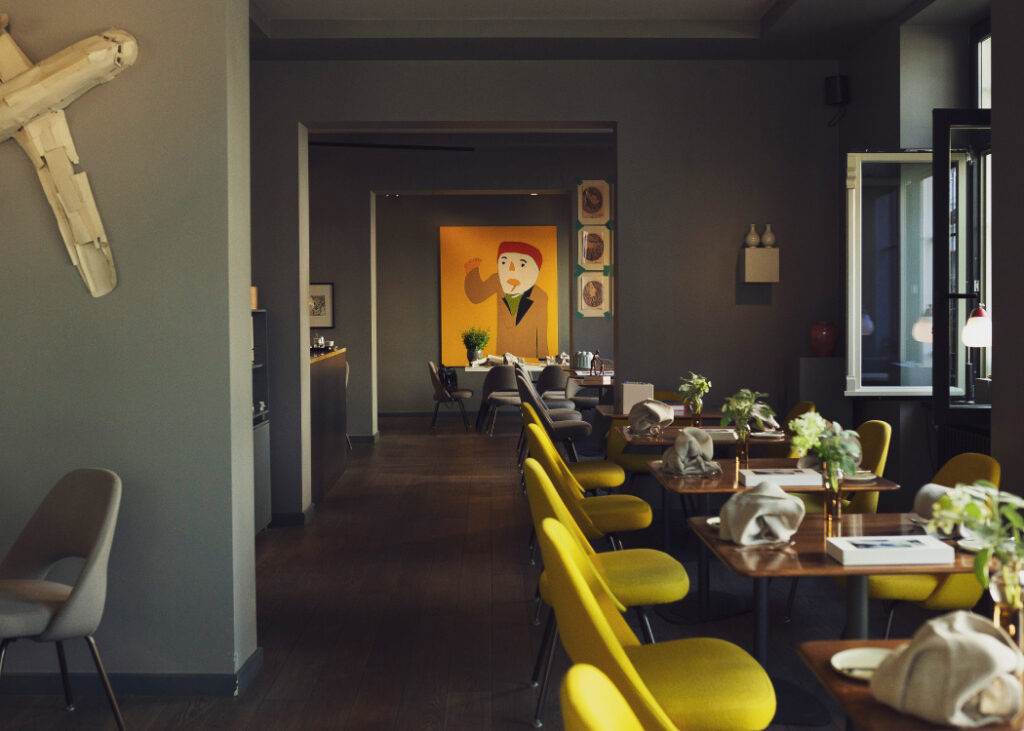 The interiors feature Bauhaus-inspired furnishings and unconventional works by young Frankfurt artists.