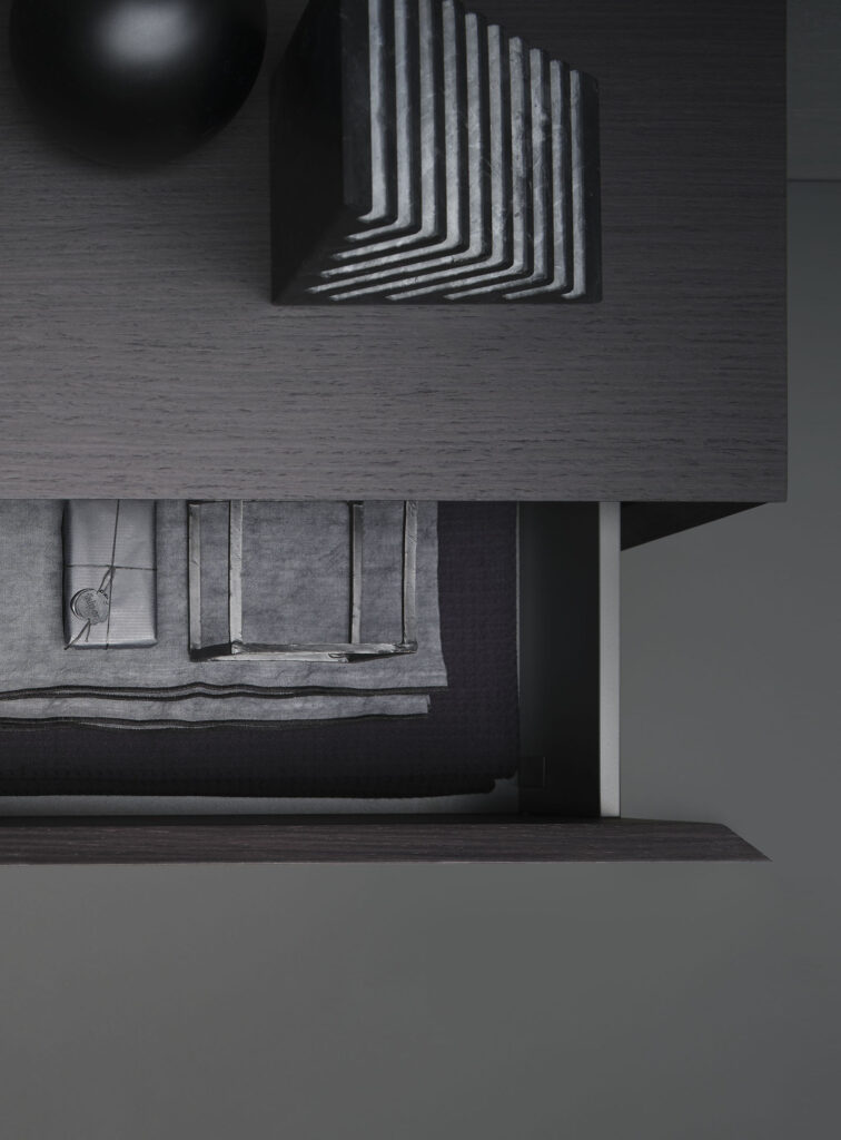 Wood finishes are created using a mixed water-based painting process on birch plywood panels, veneered in oak and walnut, with AW 100 bonding for humid environments.