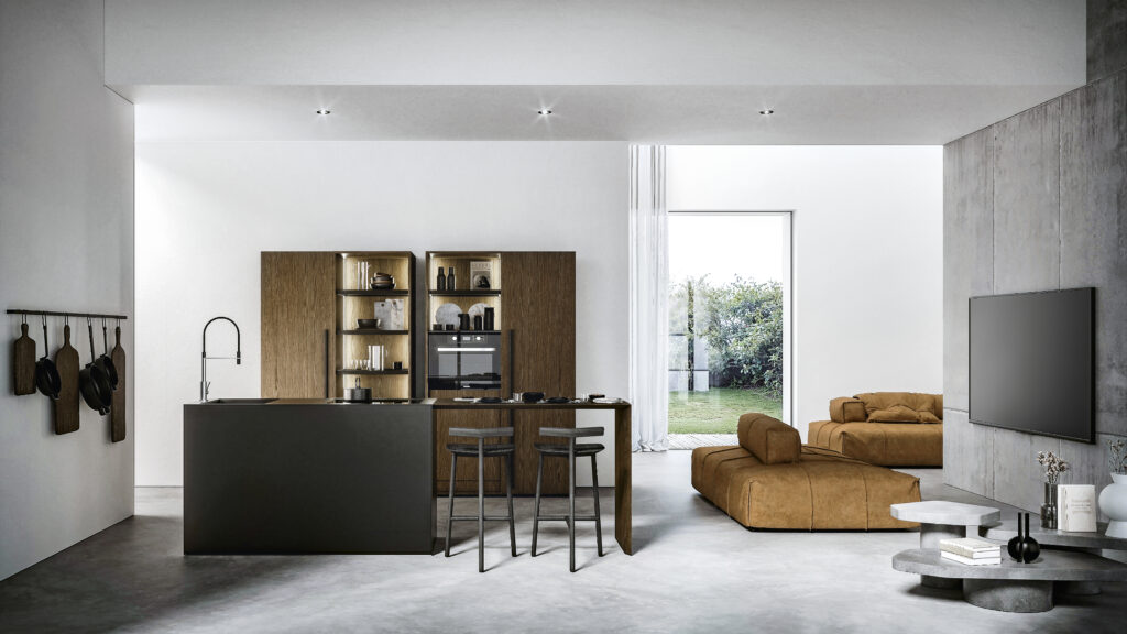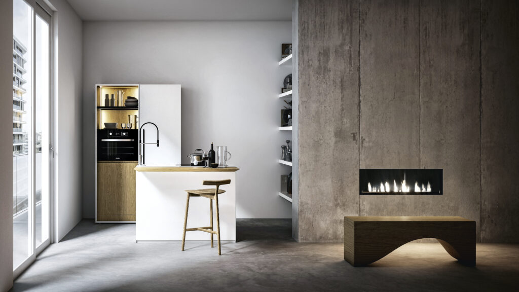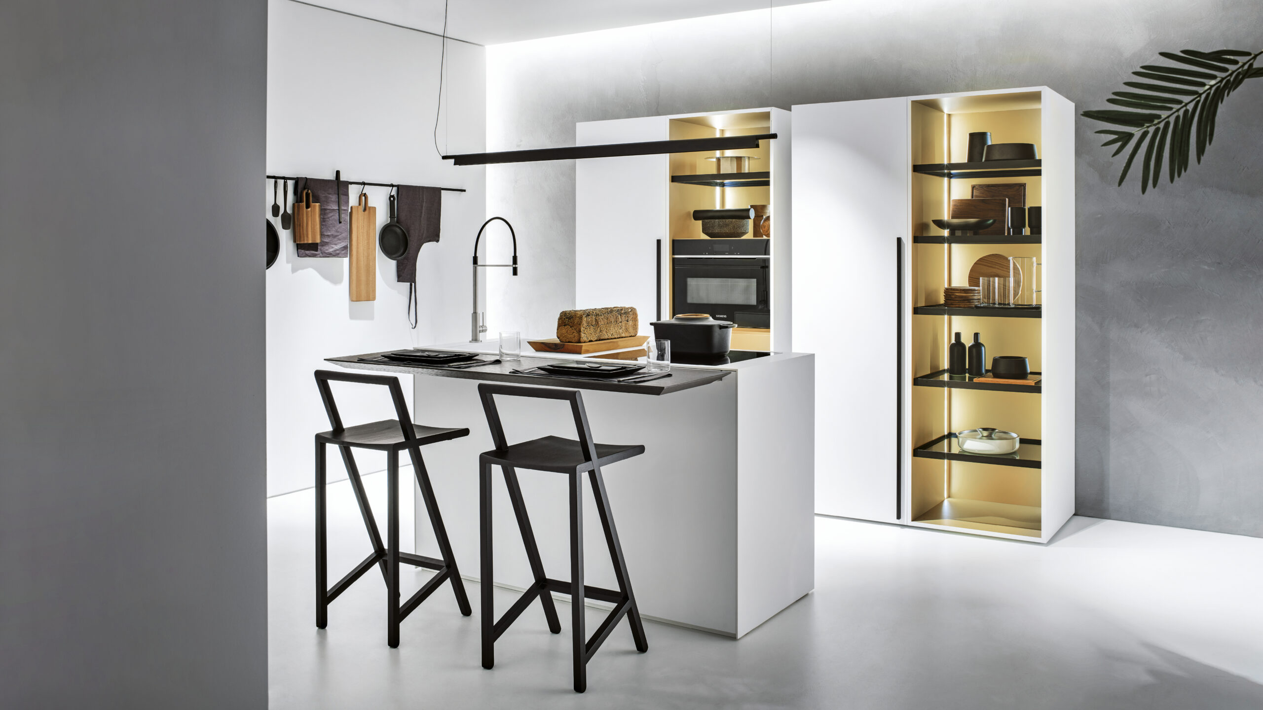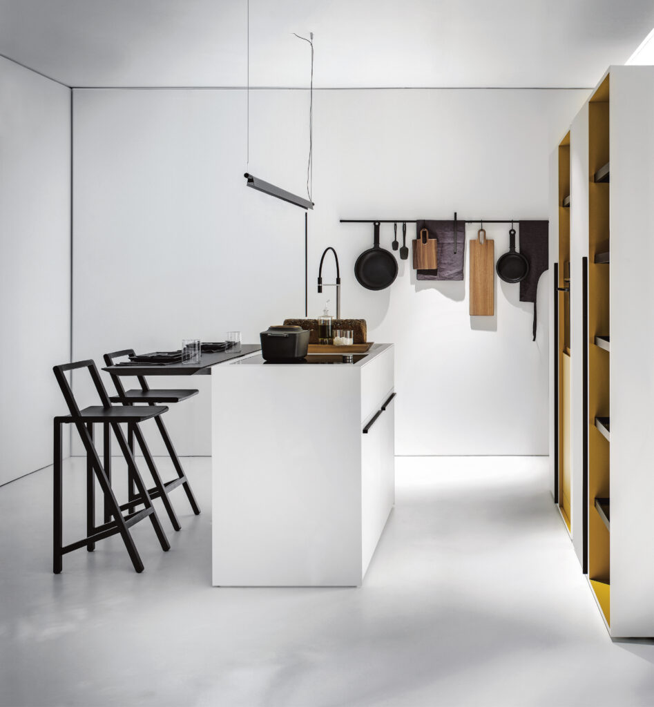 The colour range expands, with the possibility of creating two-tone kitchens. The small islands are enriched with new materials such as Fenix and highest quality laminates.