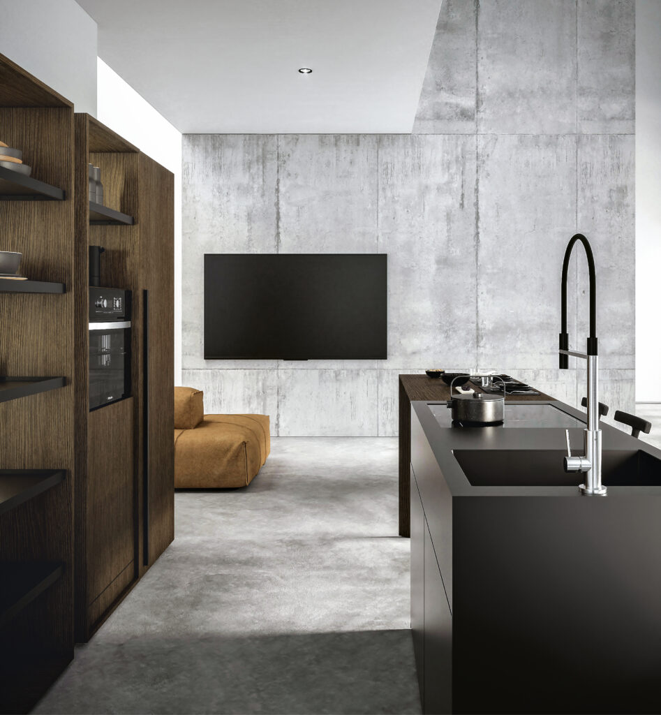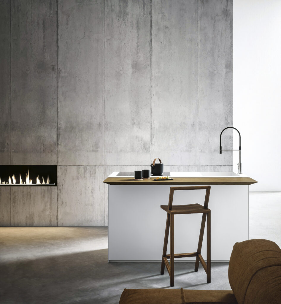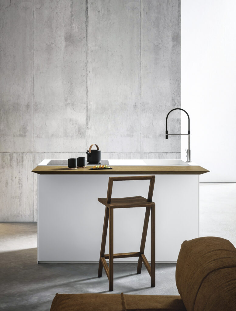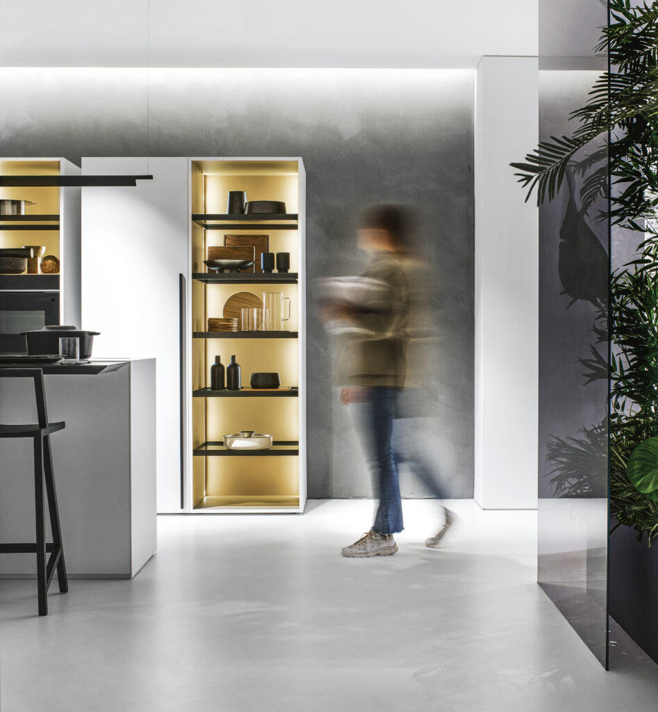The colour range expands, with the possibility of creating two-tone kitchens. The small islands are enriched with new materials such as Fenix and highest quality laminates.