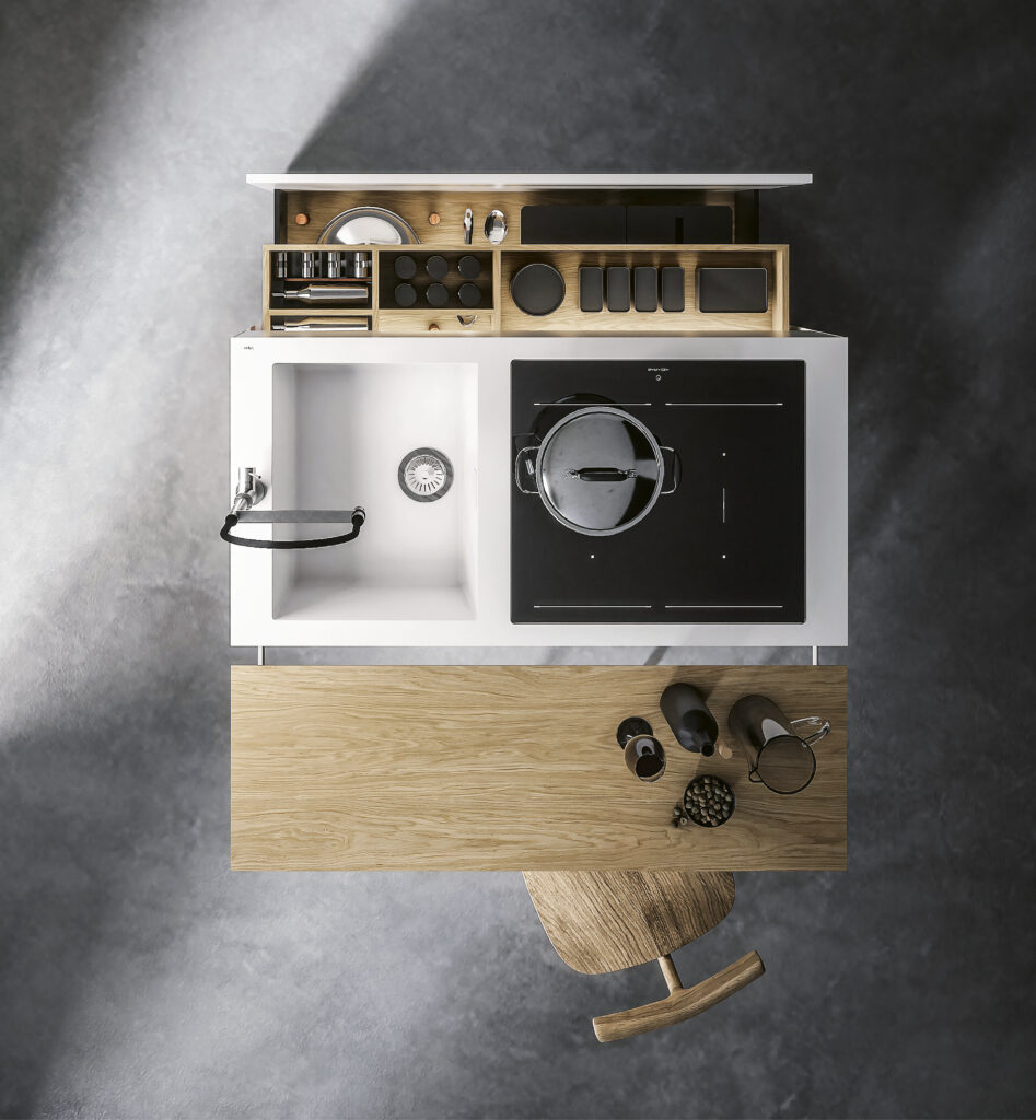 just 2.5 sqm, with island, snack table, dishwasher, fridge, oven and storage. The charm of a large kitchen, unprecedented design simplicity, ideal for small homes with style and complex residential projects.