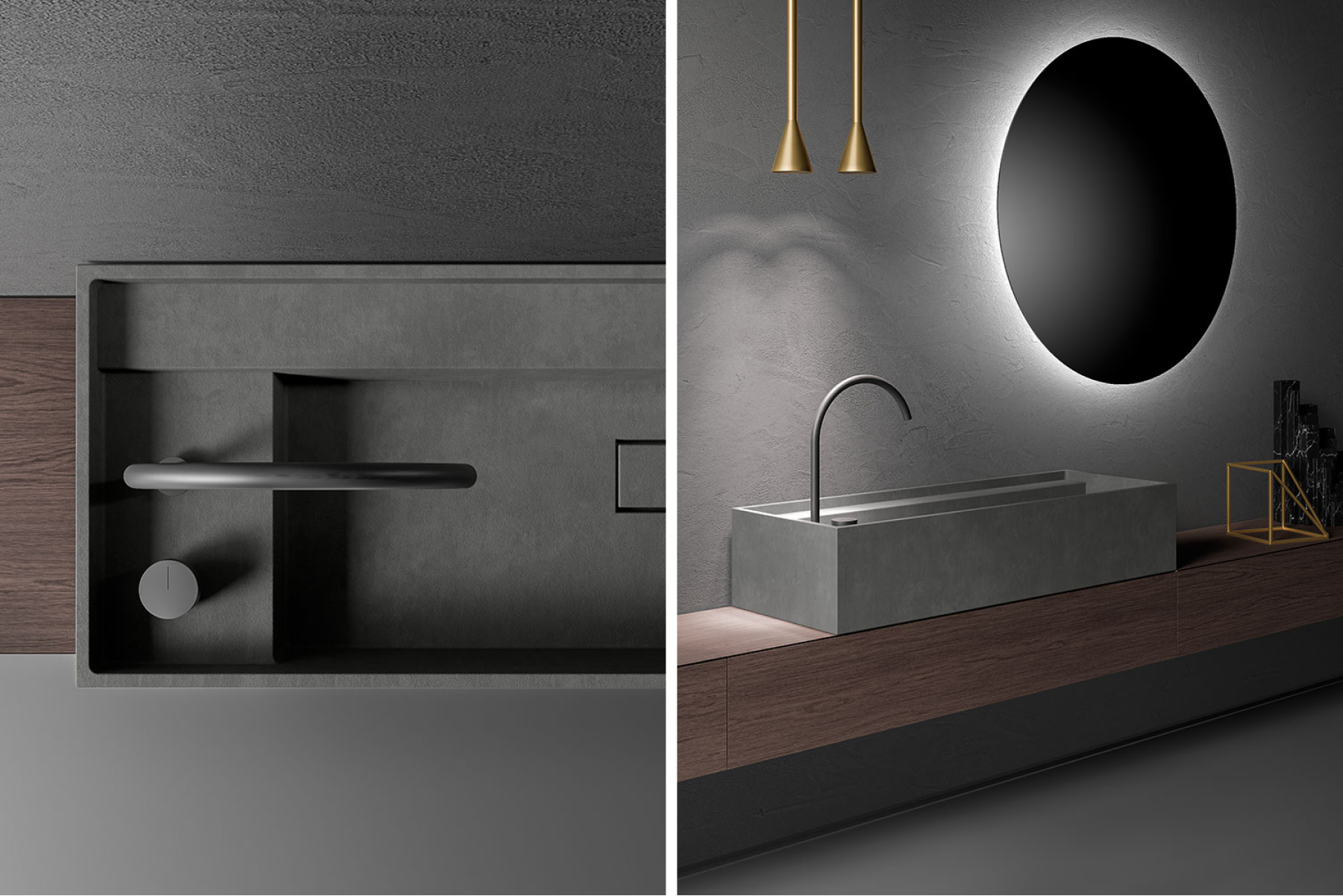 The washbasin with 120cm width is offered in ten types of marble and in concrete, with a choice of eleven different colourings.