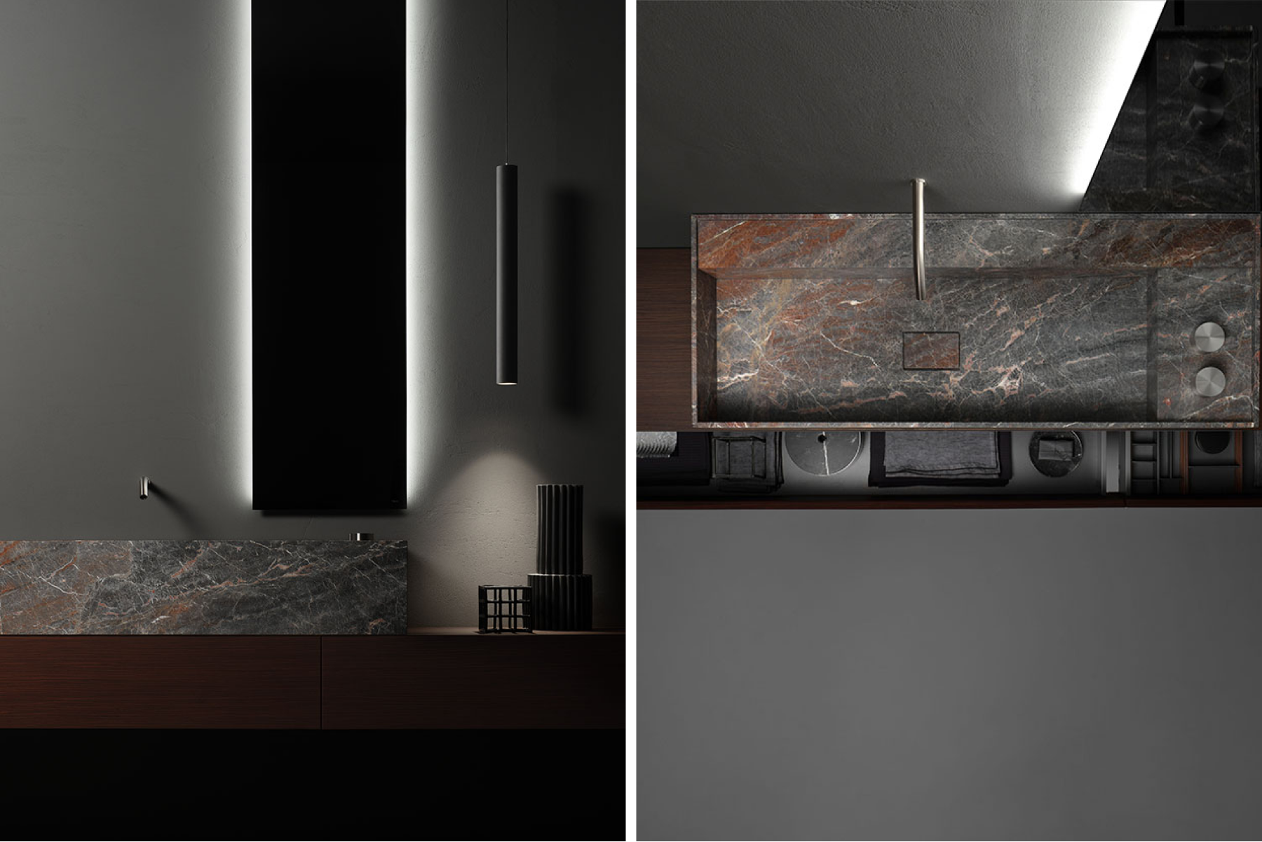 Washbasin and storage unit have been designed with a height of 25 or 36 cm. In the 25 cm height version, Minimum opens to extensive customisation whilst maintaining its essential spirit intact.
