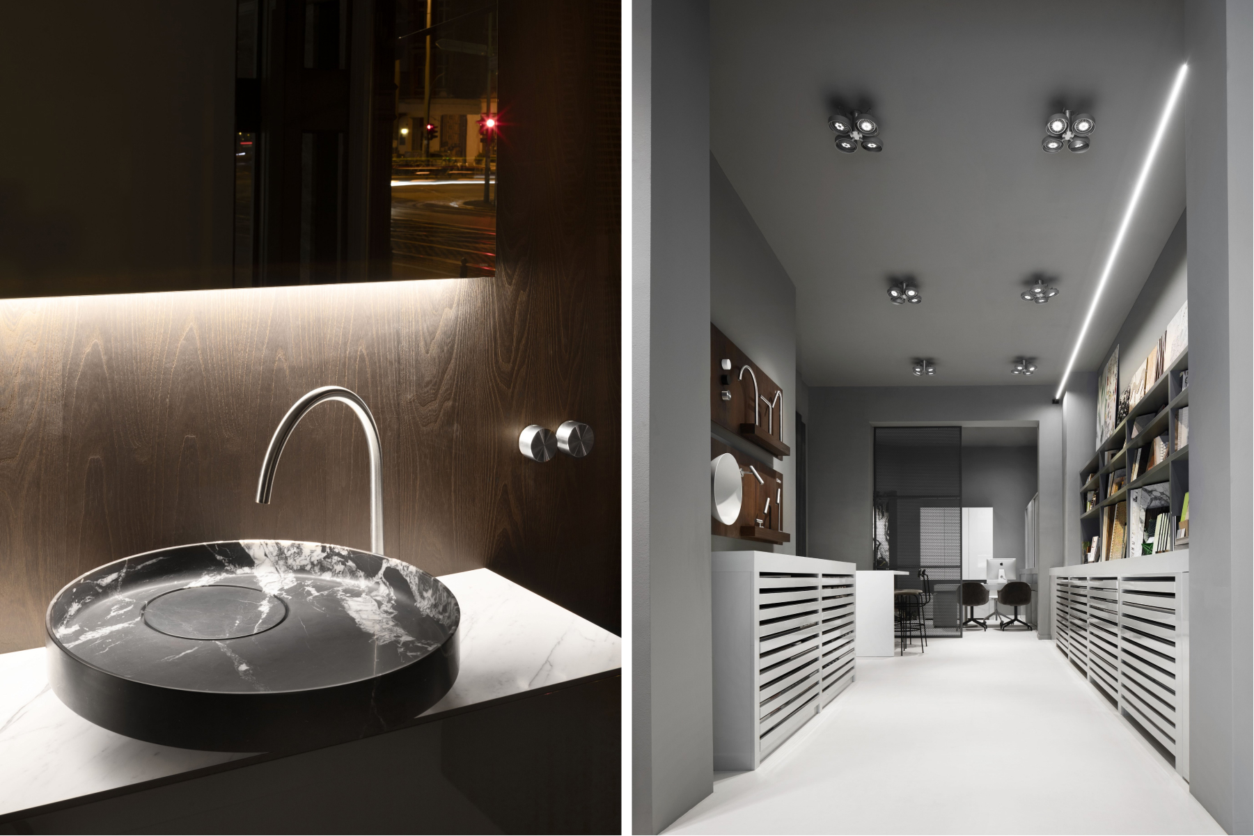 In uno spazio di circa 200 mq e due sale principali posizionate su livelli differenziati, sono presentate le collezioni Eccentrico e Wave disegnate dall’architetto Victor Vasilev, Pure e 7.0 disegnate dall’architetto Metrica, Homey, Lancetta e Controstampo disegnate rispettivamente dagli architetti Simone Bonanni, Attila Veress, Lucia Carlomagno e Vittorio Venezia.