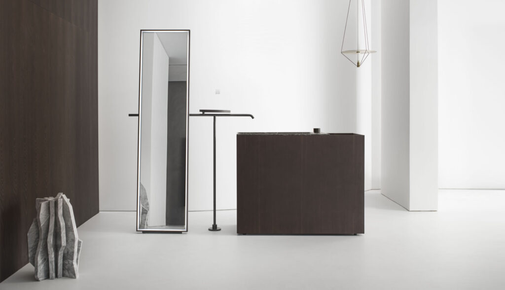 Gli elementi primari della nuova linea MA – lavabi, mobili contenitori, rubinetterie, specchi – interconnessi da sottili steli in acciaio inox per l’erogazione dell’acqua, distillano l’essenza sofisticata di un bagno, che trova il giusto equilibrio tra la ricercatezza dei dettagli e l’essenzialità dei volumi di questa collezione. Gli steli di erogazione, in apparenza delicati ma estremamente funzionali, sono un sistema adattabile a molteplici funzioni, come supporto per uno specchio illuminato o per appendere vestiti e asciugamani.