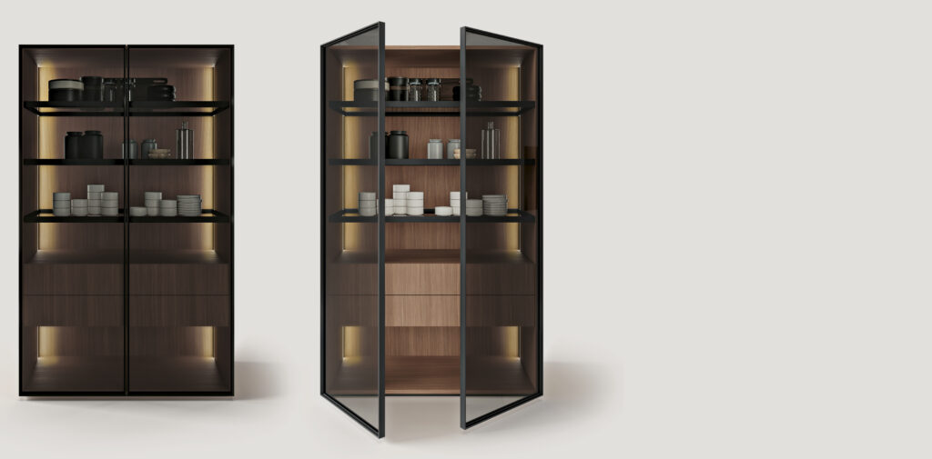 La Madia è un elemento unico, finito su tutti i lati e all’interno, configurabile internamente con undici modelli funzionali. Realizzata in legno multistrato o MDF con impiallacciature in biglia, spessore 22mm e lavorazione a 45°, è disponibile nelle finiture legno e nelle laccature lucide e opache a catalogo.