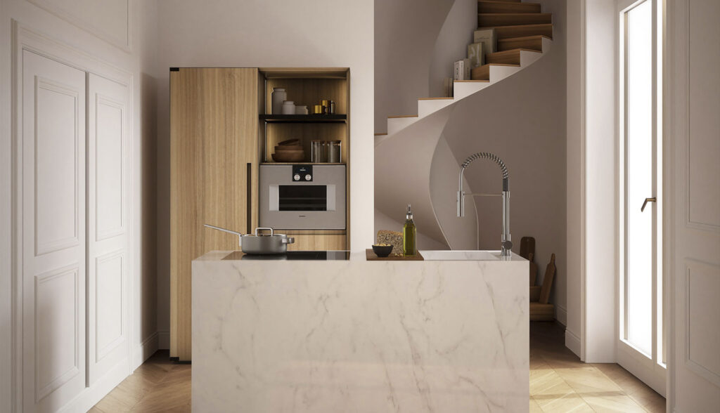 La residenza ristrutturata tra stile romano e design contemporaneo è l’ideale per il viaggiatore cosmopolita. L’ Isola della cucina è stata scelta in marmo di Carrara, selezionato tra i più preziosi della cava. La forma di un monolite al cui interno prende vita la cucina, diventa un oggetto scultoreo, dalla bellezza senza tempo. La scelta del marmo classico si addice splendidamente al centro storico di Roma. Pur rispondendo alle naturali esigenze di un continuo ammodernamento, l’appartamento preserva alcune caratteristiche dal tocco “antico”, lasciando inalterata l’atmosfera raffinata del luogo.